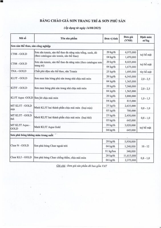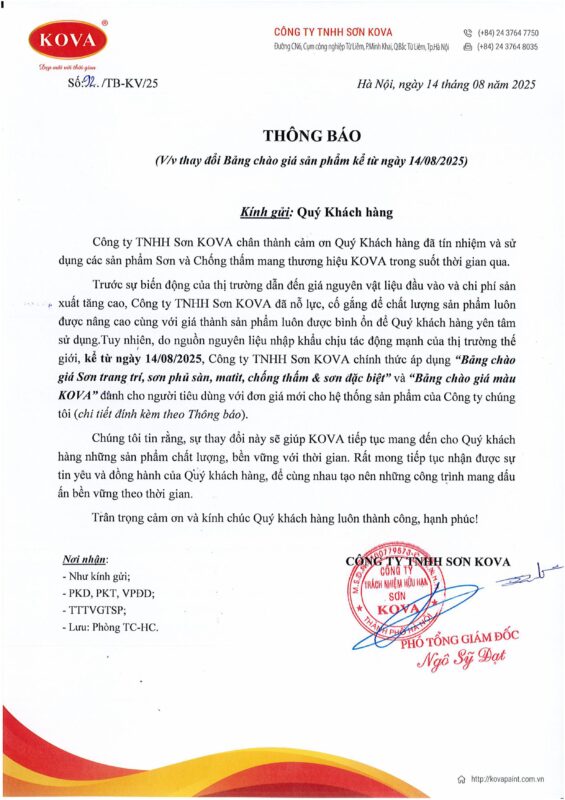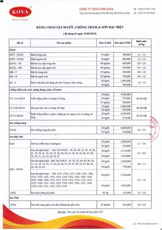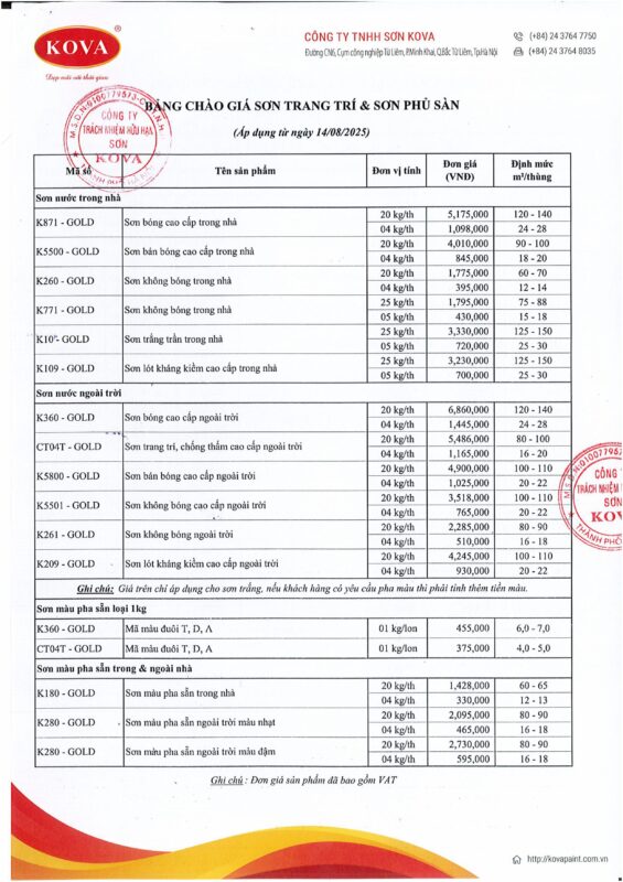 Bảng giá tiêu chuẩn sơn Kova là bảng giá bán lẻ dành cho người tiêu dùng được phát hành bởi Tập đoàn Sơn Kova (hay còn được gọi là Giá hãng). Bảng giá này có hiệu lực từ ngày 14/08/2025 và là cơ sở duy nhất để tính toán giá thành của các sản phẩm sơn Kova cho khách hàng. Tùy theo chương trình khuyến mại tại mỗi thời điểm của mỗi đại lý, khách hàng sẽ nhận được mức chiết khấu khác nhau cho mỗi sản phẩm và bảng giá này cũng là cơ sở duy nhất để tính chiết khấu.